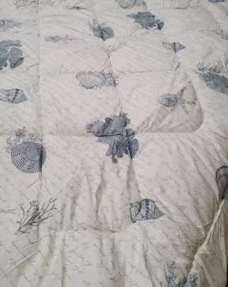 物流很快,水星家纺的被子搞活动买的,价格实惠,包装高大.上,外面的袋子很结实,里面还有-层真空包装袋,被子很干净,每个边上都有三个固定扣,用来固定被子的,细节很好。被子的手感不错,很蓬松很柔软,厚度也适合春秋的时候盖,这款是带图案的被子芯,图案挺好看的,大海贝壳类的图案,让被芯更好看。